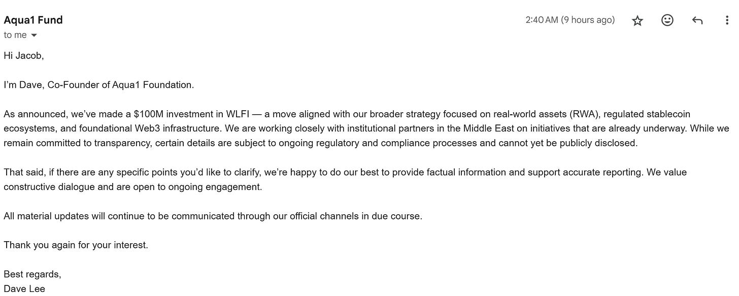 I have asked World Liberty Financial’s outside PR repeatedly about this deal, including an email yesterday in which I wrote that I had likely identified the person behind Aqua 1 Foundation. They have not answered any questions. I have tweeted at “Dave Lee” on X several times, including letting him know that I had identified him, and he has not replied. Yesterday, I emailed the person I believe is Dave Lee. I also sent him a message on LinkedIn. He then deactivated his LinkedIn account. In short, I’ve given Dave Lee, Aqua 1 Foundation, and World Liberty Financial every possible opportunity to comment or refute my claims. They haven’t, nor have they provided journalists or the public any useful information about what is going on here.